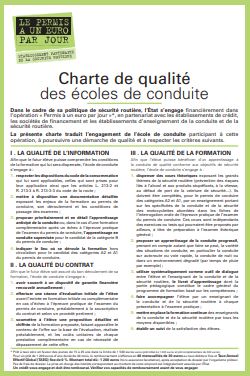 Happy Conduite participe à l’opération « permis à un euro par jour ». En effet l’auto-école a signé la convention de la mise en place du dispositif. De ce fait elle vous remettra un contrat de formation faisant office de devis, à remettre à votre établissement bancaire.